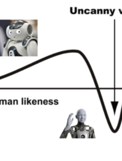 Masahiro Mori sukurtas keistojo slėnio grafikas: didėjant roboto panašumui į žmogų (horizontalioji ašis), didėja ir mūsų afinitetas robotui (vertikali ašis), bet tik iki tam tikro taško. Kai kuriems tikroviškiems robotams mūsų reakcija į juos smarkiai sumažėja, jie atrodo atstumiantys ar šiurpinantys. Tai yra keistojo slėnio grafikas.